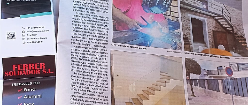 Joaquim Morales está al frente de la empresa Ferrer Soldador S.L. La fundó en el 2021, pero lleva 27 años dedicándose al oficio de herrero y soldador. Desde su taller de Cistella, ofrece servicio a particulares y empresas. Es especialista en estructuras, es soldador calificado y homologado con una amplia experiencia en el sector. Hace diferentes tipos de soldadura MMA, Medio Mago y Tig. Además trabaja con metales inoxidables como el aluminio y el acero. Fabrica e instala rejas, vallas perimetrales, barandillas, puertas de garaje de cualquier tipo y tamaño, automatismos, etc. También monta puertas y ventanas de aluminio, persianas y mosquiteras. Con su experiencia, puede ofrecer cualquier solución adaptada a cada situación, ofreciendo así una amplia gama de servicios y trabajos en muchos ámbitos. Asimismo, con sus conocimientos, puede trabajar fácilmente en el sector alimenticio o náutico. Realiza desde reparaciones, hasta proyectos grandes, pasando por servicios de mantenimiento. En cuanto a clientes particulares, sus soluciones siempre están orientadas a dar soporte al proyecto que el cliente tiene en la cabeza. Ofrece servicios de refuerzo de soldadura, fabricación y asistencia a talleres del propio sector. Por todo ello, puede asegurarse que Joaquim Morales se adapta a las particularidades de cualquier proyecto con facilidad y busca soluciones. Todo esto es posible porque no tiene miedo, innova y prueba hasta encontrar la mejor forma de hacer realidad los proyectos. «Solo imagínatelo, yo te lo hago», afirma. Puedes ver el original en el siguiente enlace:
